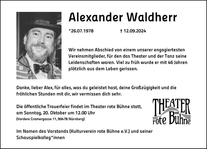 leider muss ich eine sehr traurige Mitteilung machen. Auf meine Nachfrage bei der Polizei am 1. Oktober erfuhr ich, dass unser langjähriges Fördermitglied, ehrenamtlicher Helfer und Schauspieler Alexander Waldherr verstorben ist. Bereits am 12.9.2024 durch einen tödlichen Autounfall. Er verstarb noch an der Unfallstelle.