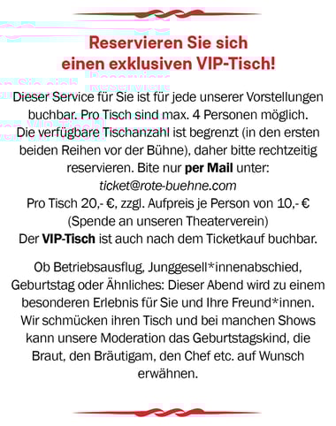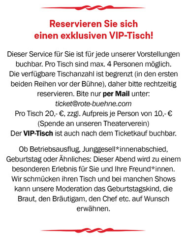 Bitte fragen Sie im Theaterbüro nach, ob für die gewünschte Vorstellung (noch) eine VIP-Tisch-Buchung möglich ist.