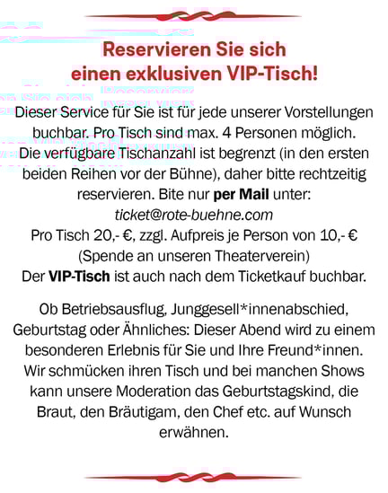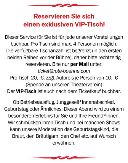 Da unser Theatersaal nur begrenzten Platz bietet, bitten wir um Verständnis, sollte eine Tisch-Buchung aufgrund einer ausverkauften Veranstaltung nicht mehr möglich sein.